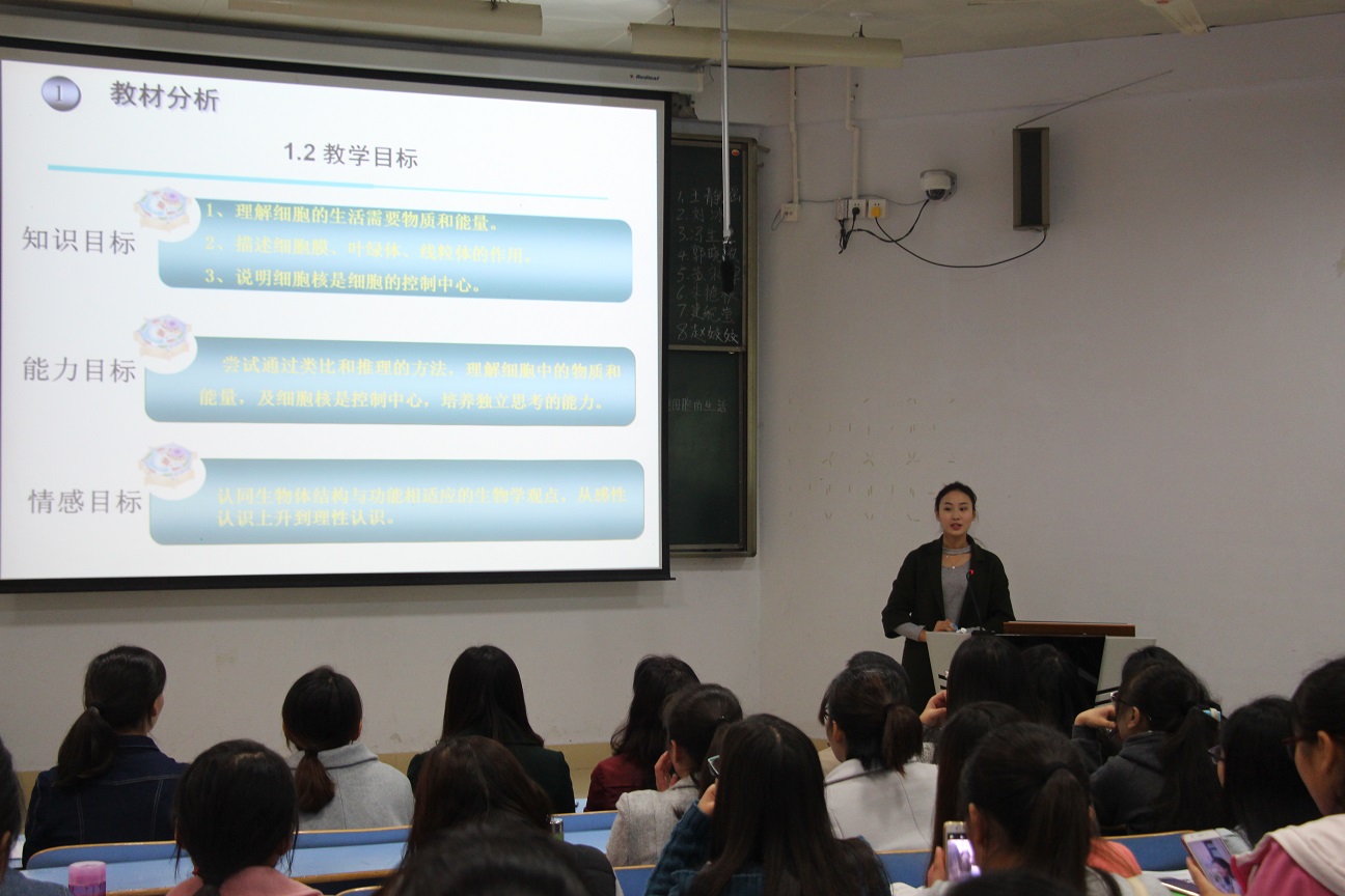 比赛开始前,即将代表我校参加河南省说课大赛的2013级生物科学1班韩露同学进行说课展示,她自信从容的说课赢得了现场观众的阵阵掌声。答辩环节,她的教育理念获得了评委老师的称赞。