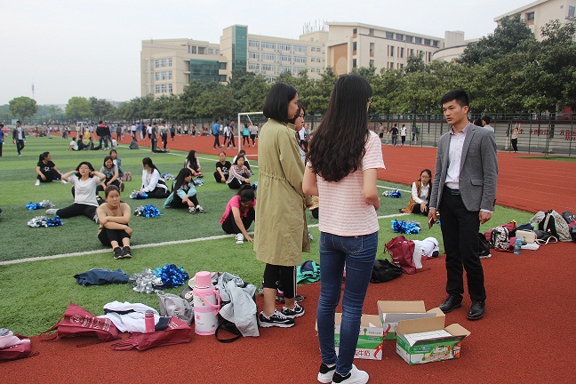 4月22日,我院团总支书记孙太红老师为健美操队员送去食物补给,向教练了解训练进度,并与健美操队员们亲切交谈。