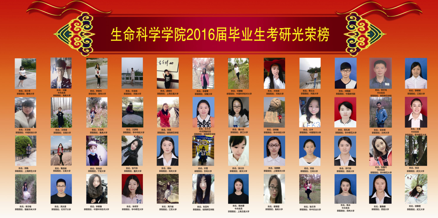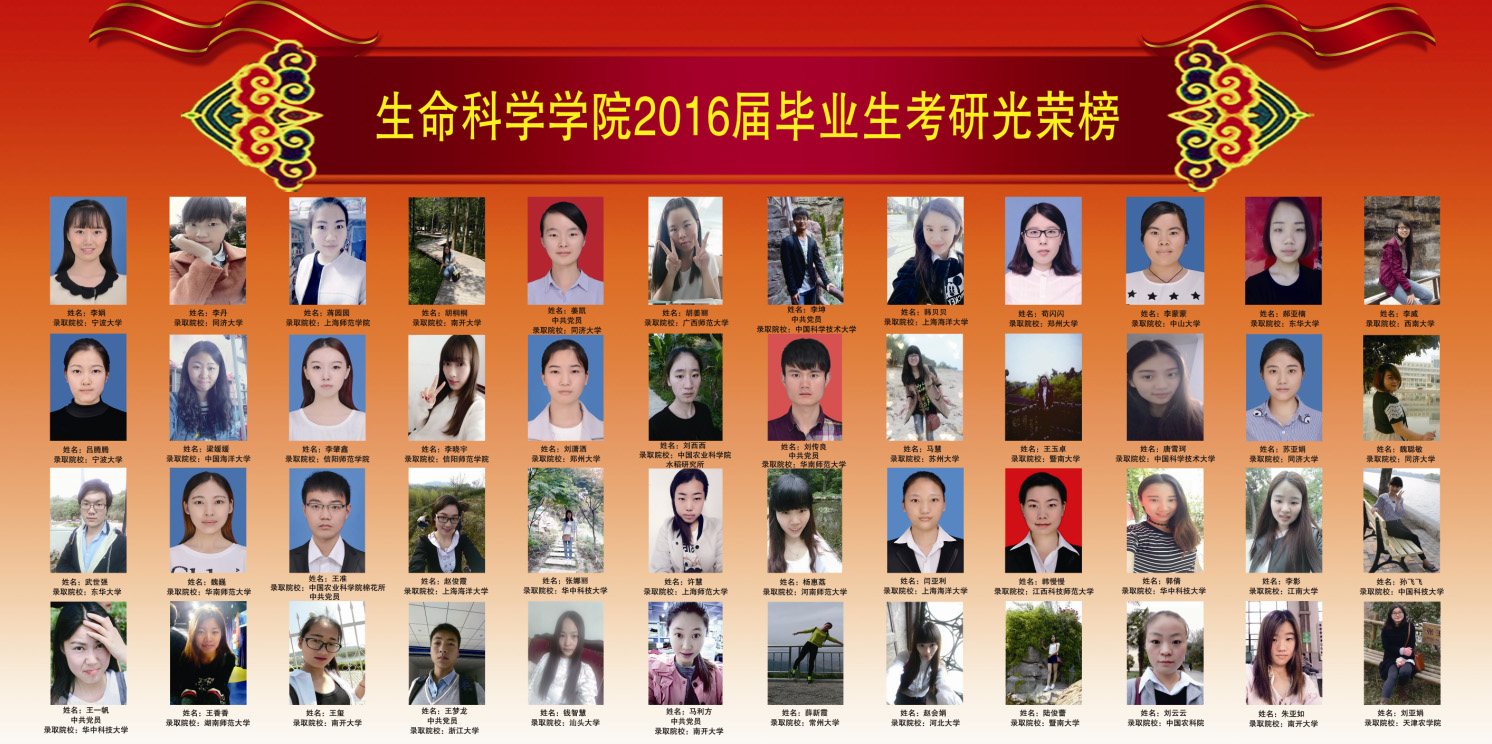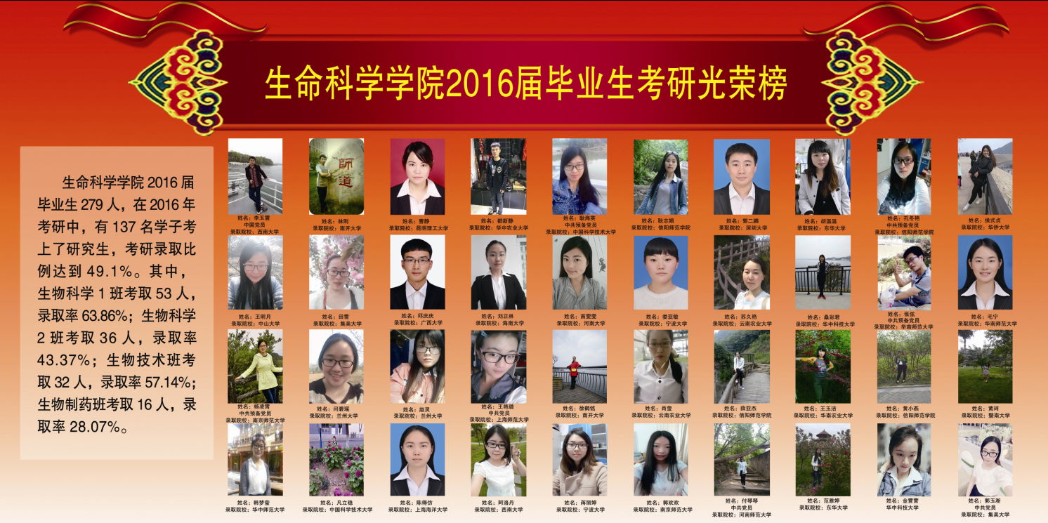 云顶4008登录2016届毕业生279人,在2016年考研中,有137名学子考上了研究生,考研录取比例达到49.1%。其中,生物科学1班考取53人,录取率63.86%;生物科学2班考取36人,录取率43.37%;生物技术班考取32人,录取率57.14%;生物制药班考取16人,录取率28.07%;三个学生宿舍全体考上研究生。